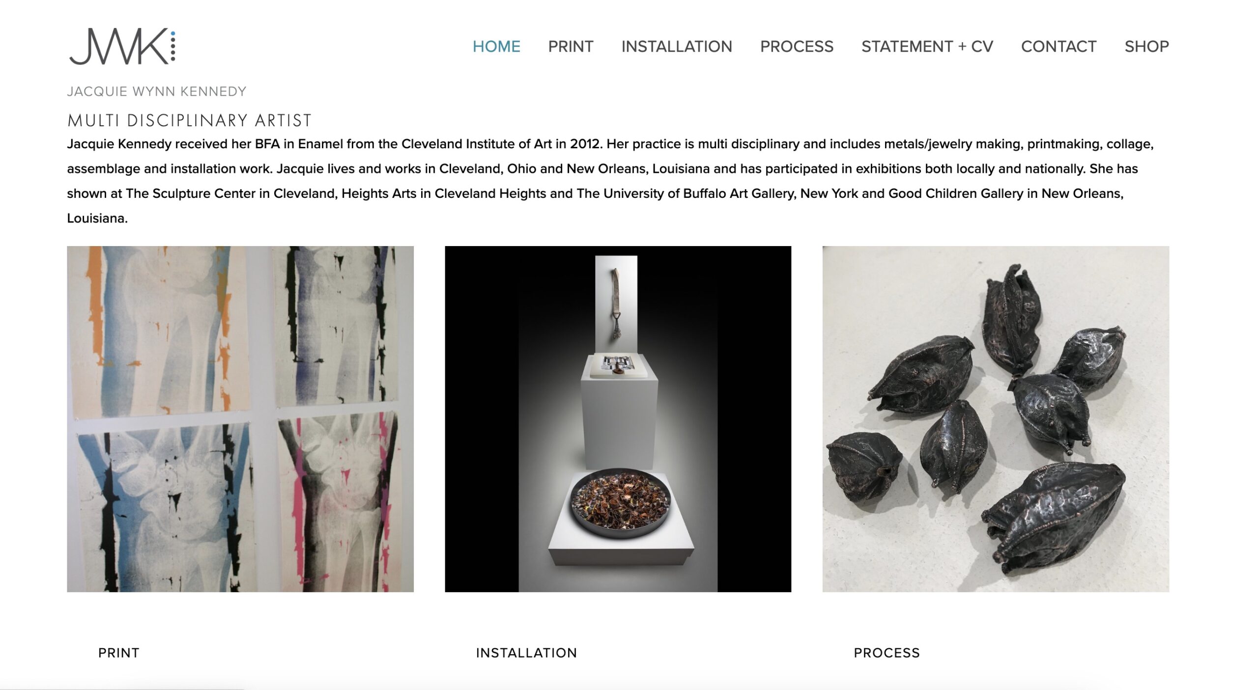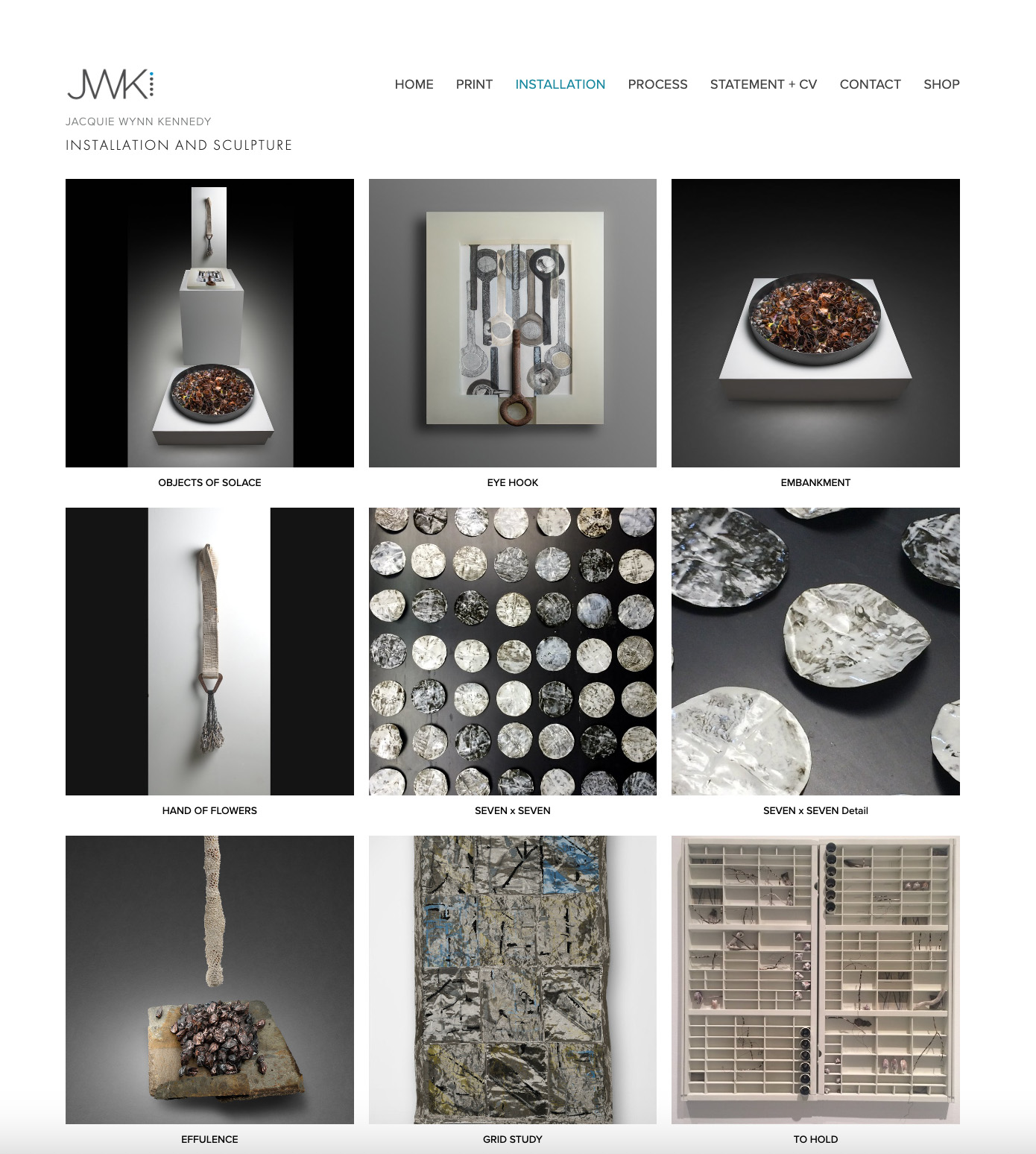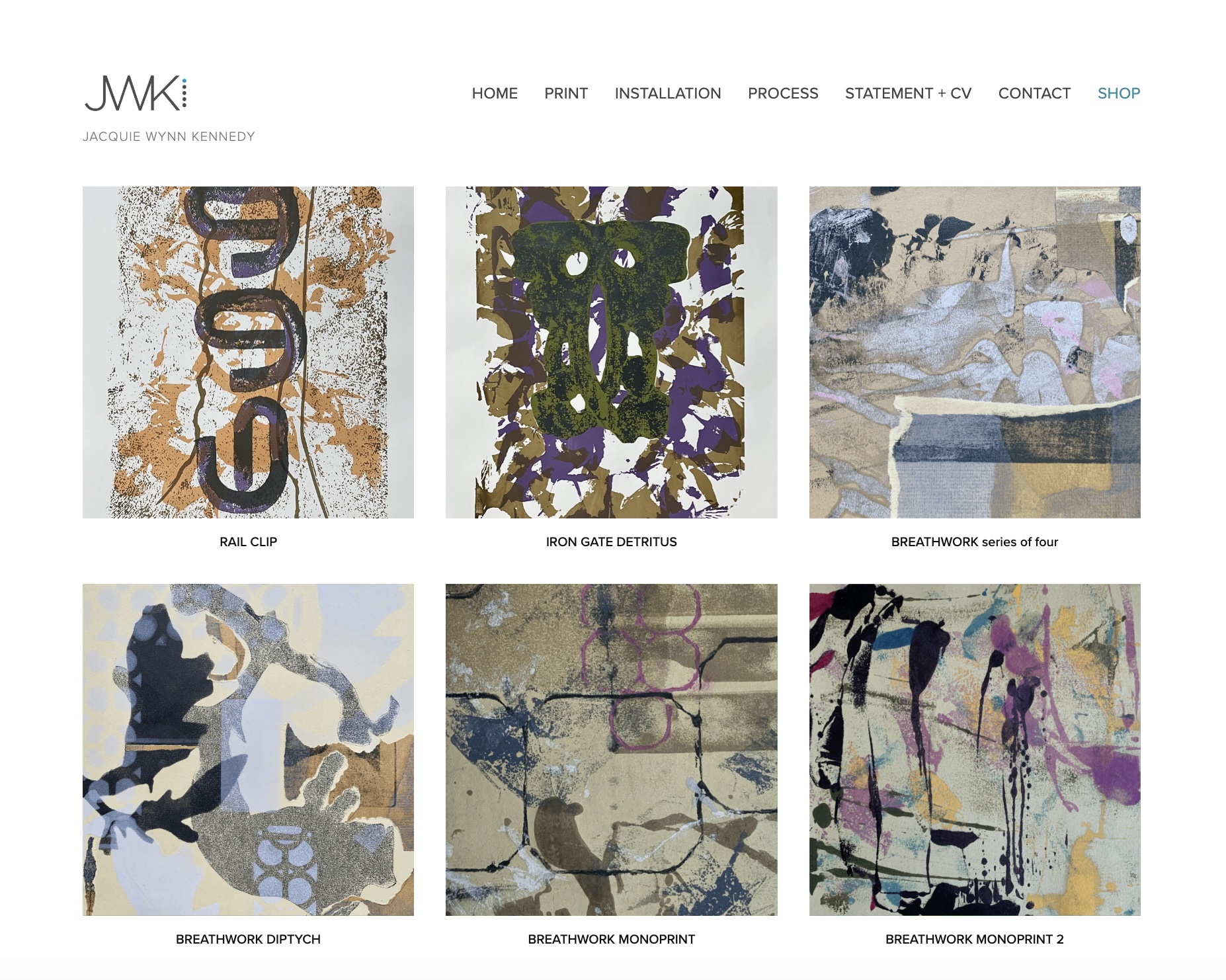 Squarespace JWK website shop of artist, Jacquie Wynn Kennedy that shows her printmaking, jewelry and sculpture and installations.